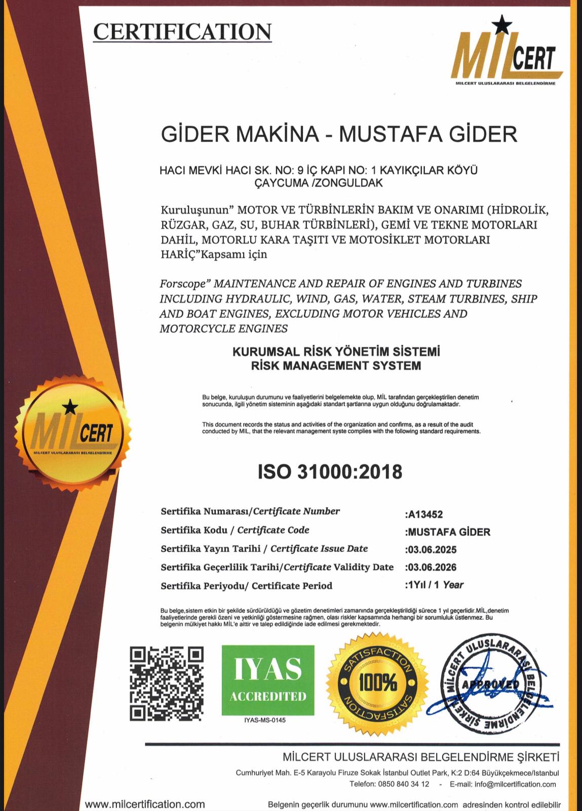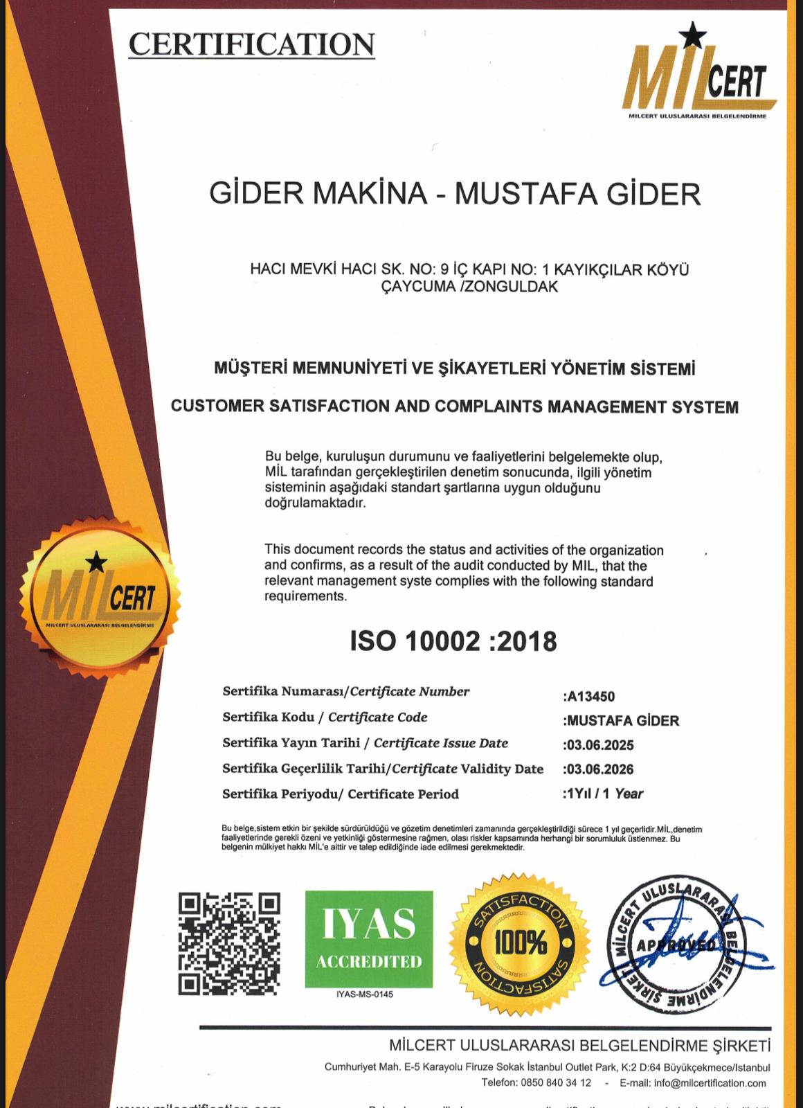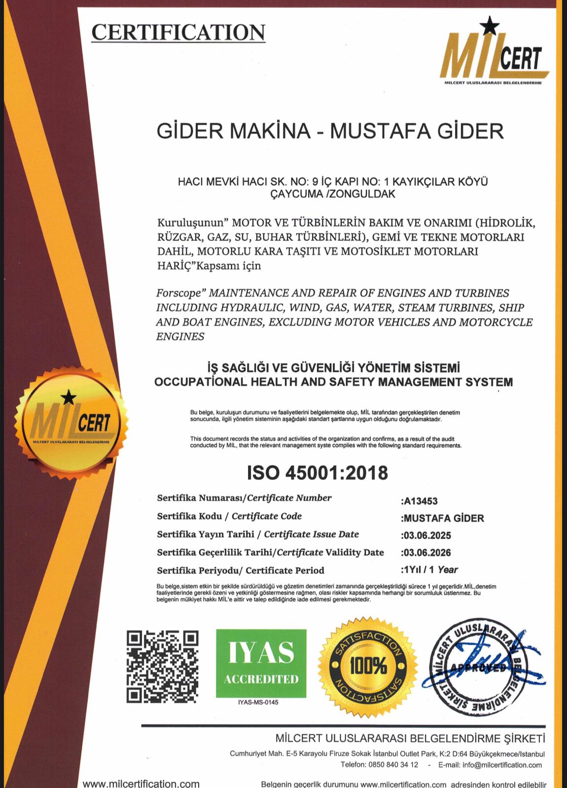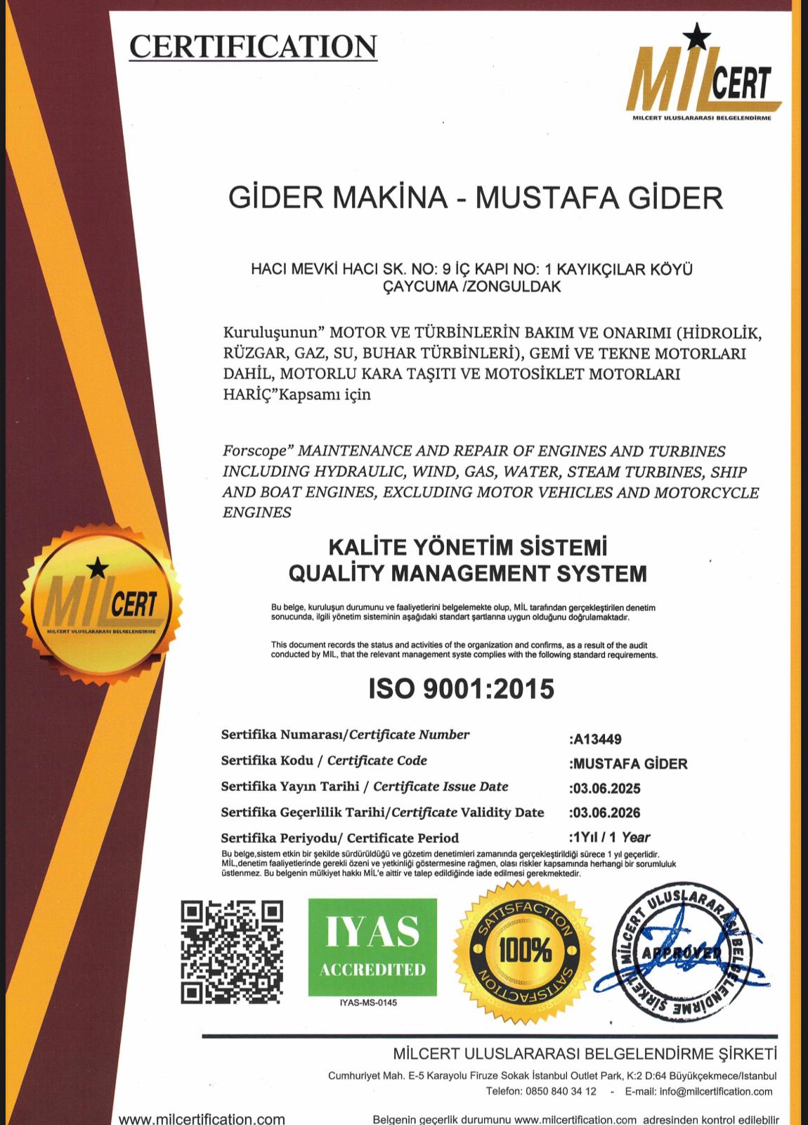 Gider Makina olarak sunduğumuz tüm hizmetlerde kalite, güvenlik ve uzmanlık önceliğimizdir. Bu doğrultuda sahip olduğumuz sertifikalar, hem teknik yeterliliğimizi hem de sektörel standartlara bağlılığımızı belgelemektedir. Aşağıda yer alan sertifikalarımızla hizmet kalitemizi belgeliyoruz.